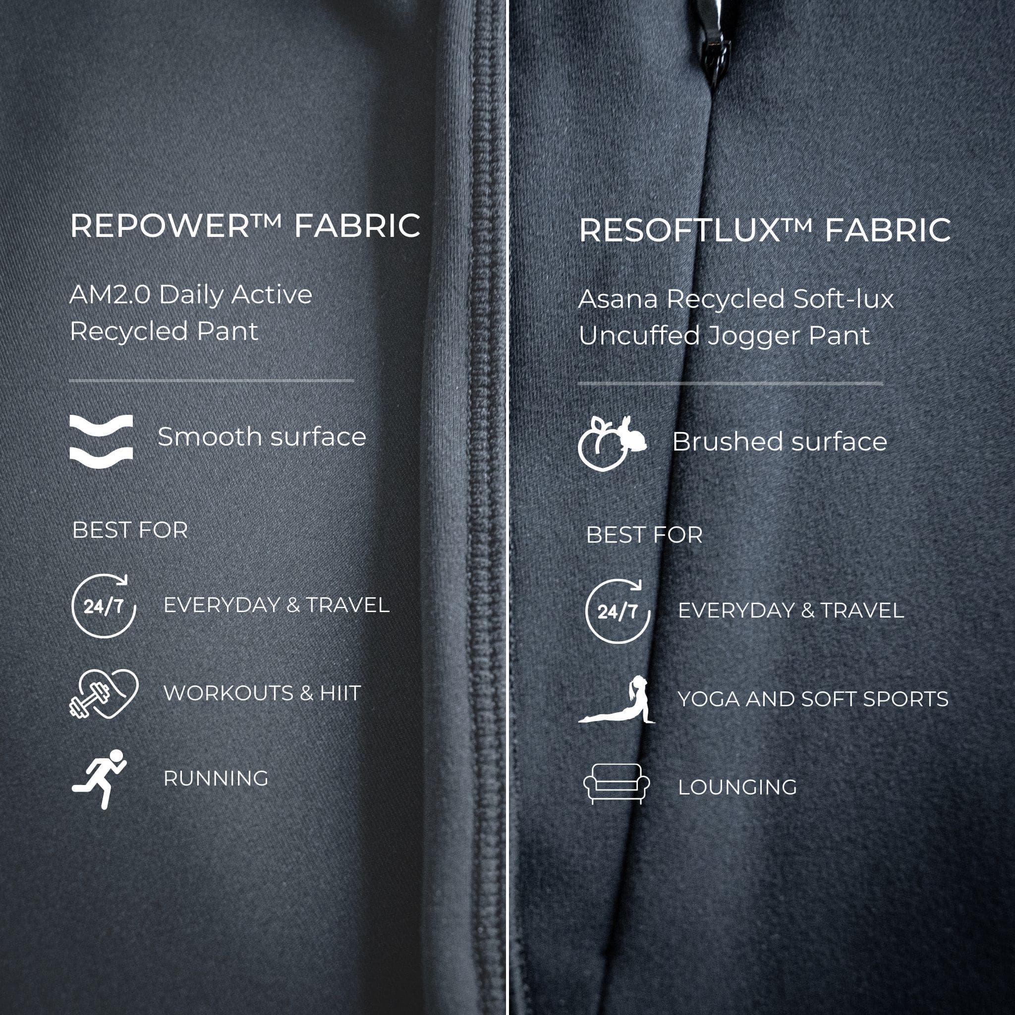 The major difference between these two pants is the fabric used and how they feel. The AM2.0 pant is made from our smooth double-knit REPOWER™ fabric whilst our Asana pant is made from RESOFTLUX™, a similar double-knit fabric but has undergone a peaching or brushed treatment.
