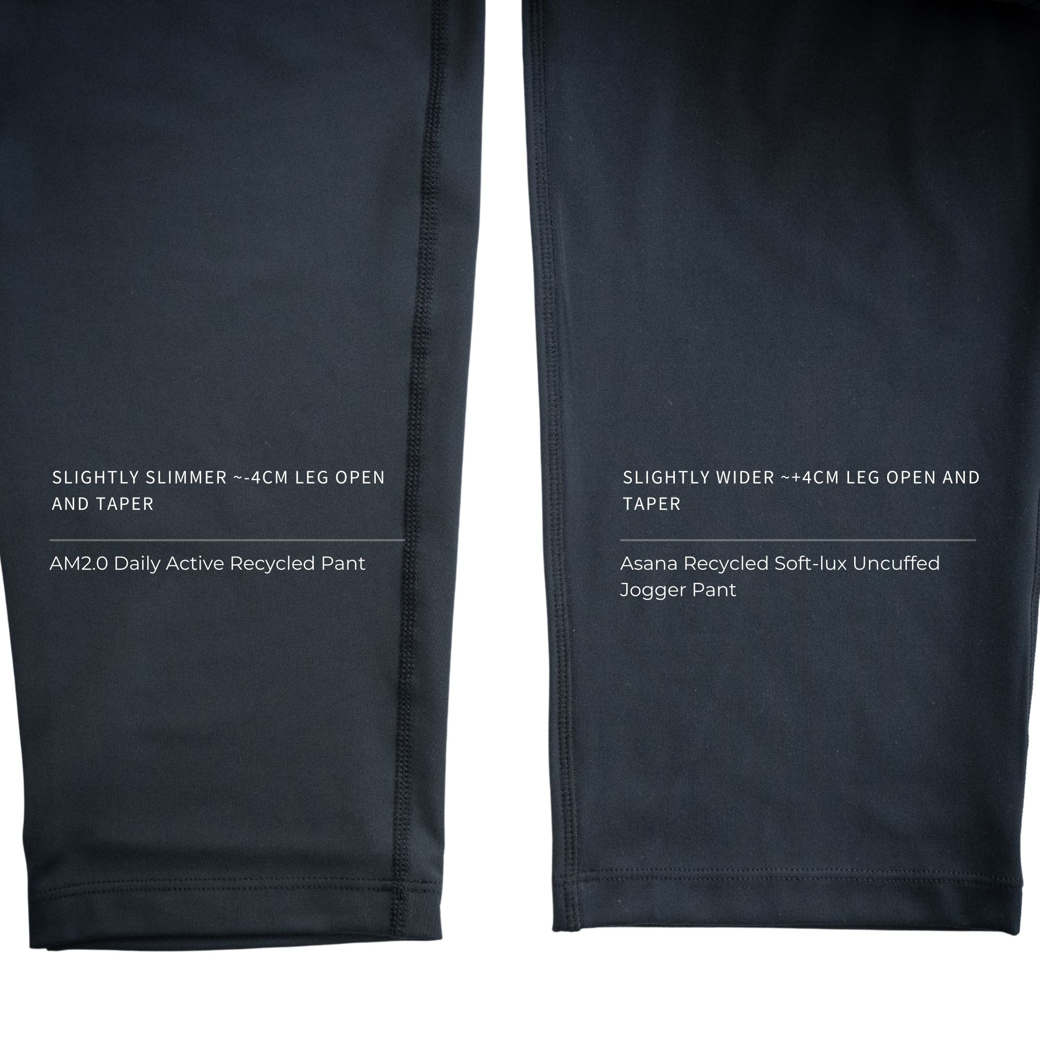 The AM2.0 pant has a slightly slimmer leg opening compared to the Asana uncuffed jogger pant.