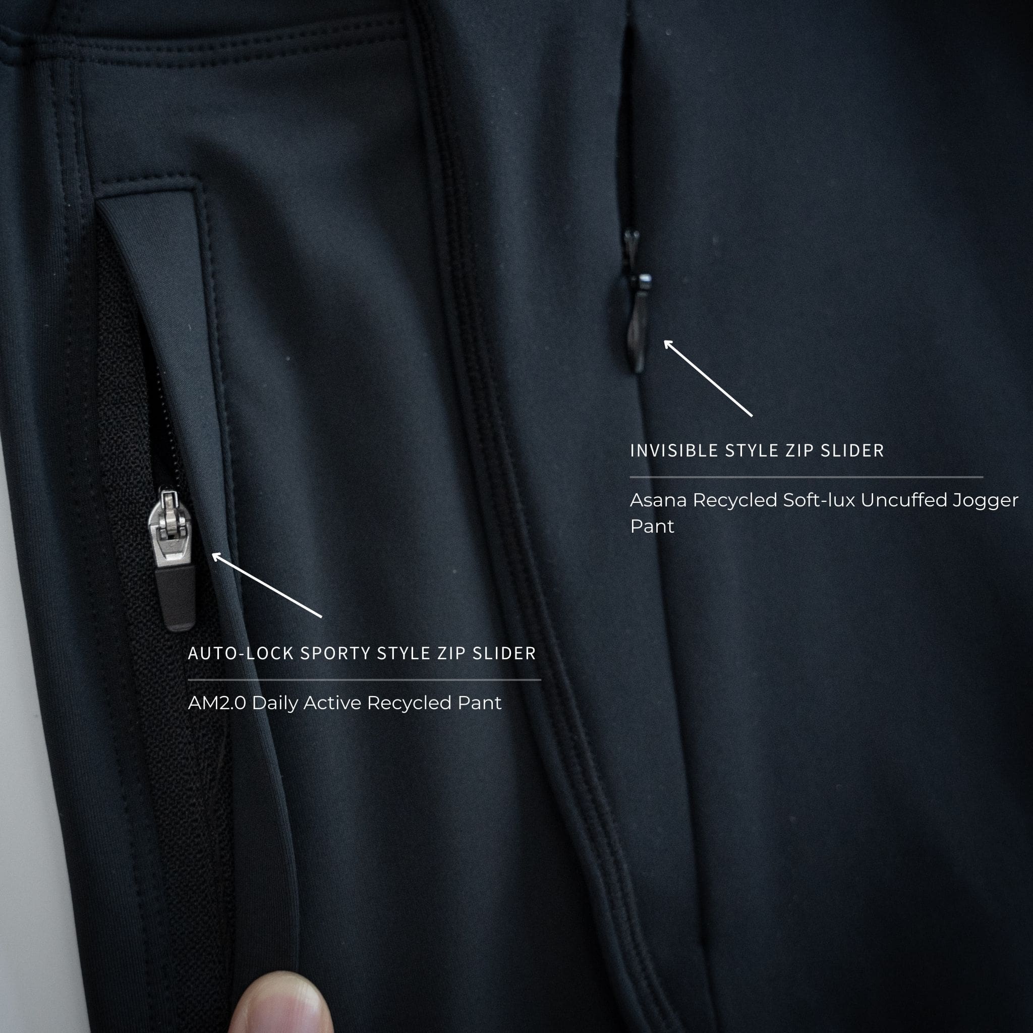 The AM2.0 pant is uses an SBS auto-locking zip slider with a PU tab whilst the Asana uncuffed jogger pant has an SBS invisible style zip slider.