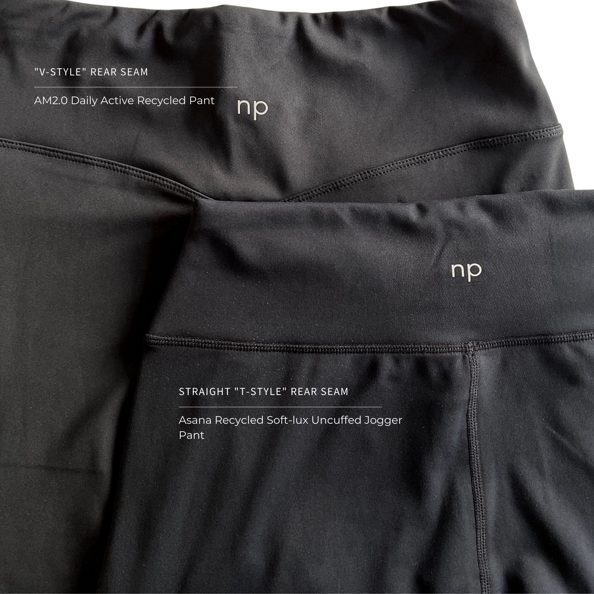 The AM2.0 pant has a "V-style" rear seam similar to that found on our leggings and asana jogger. The Asana uncuffed jogger pant has instead, a clean "T-style" rear seam.