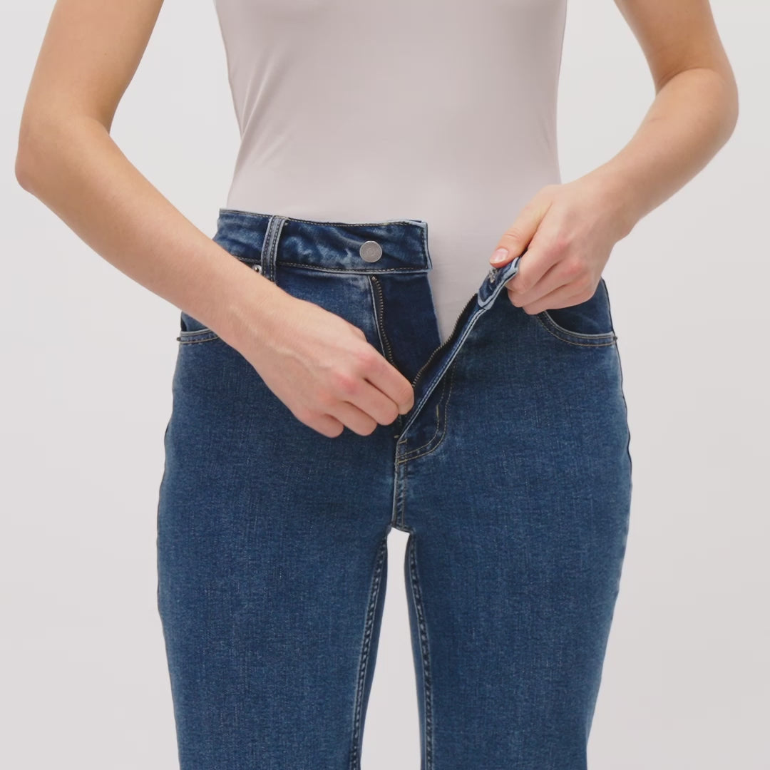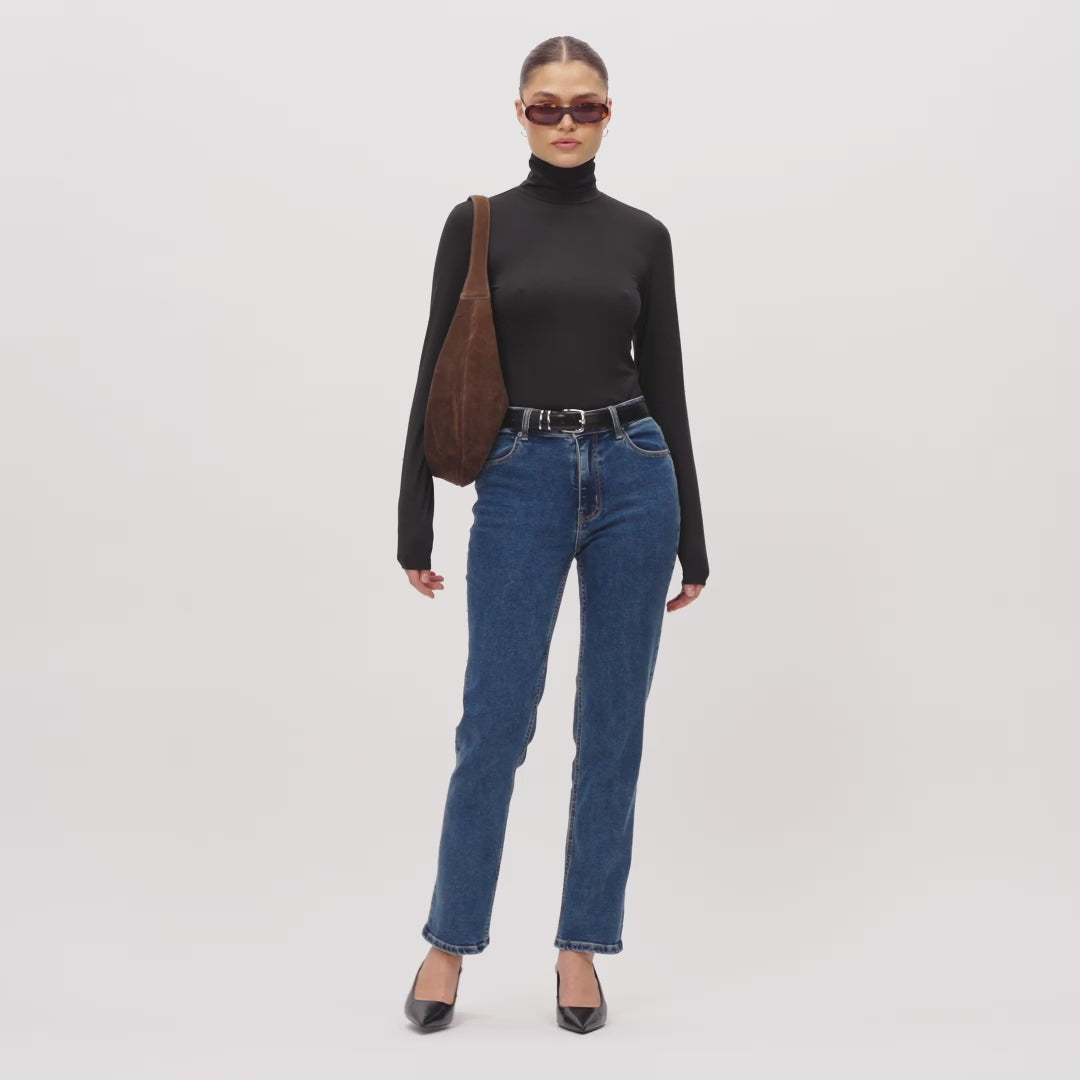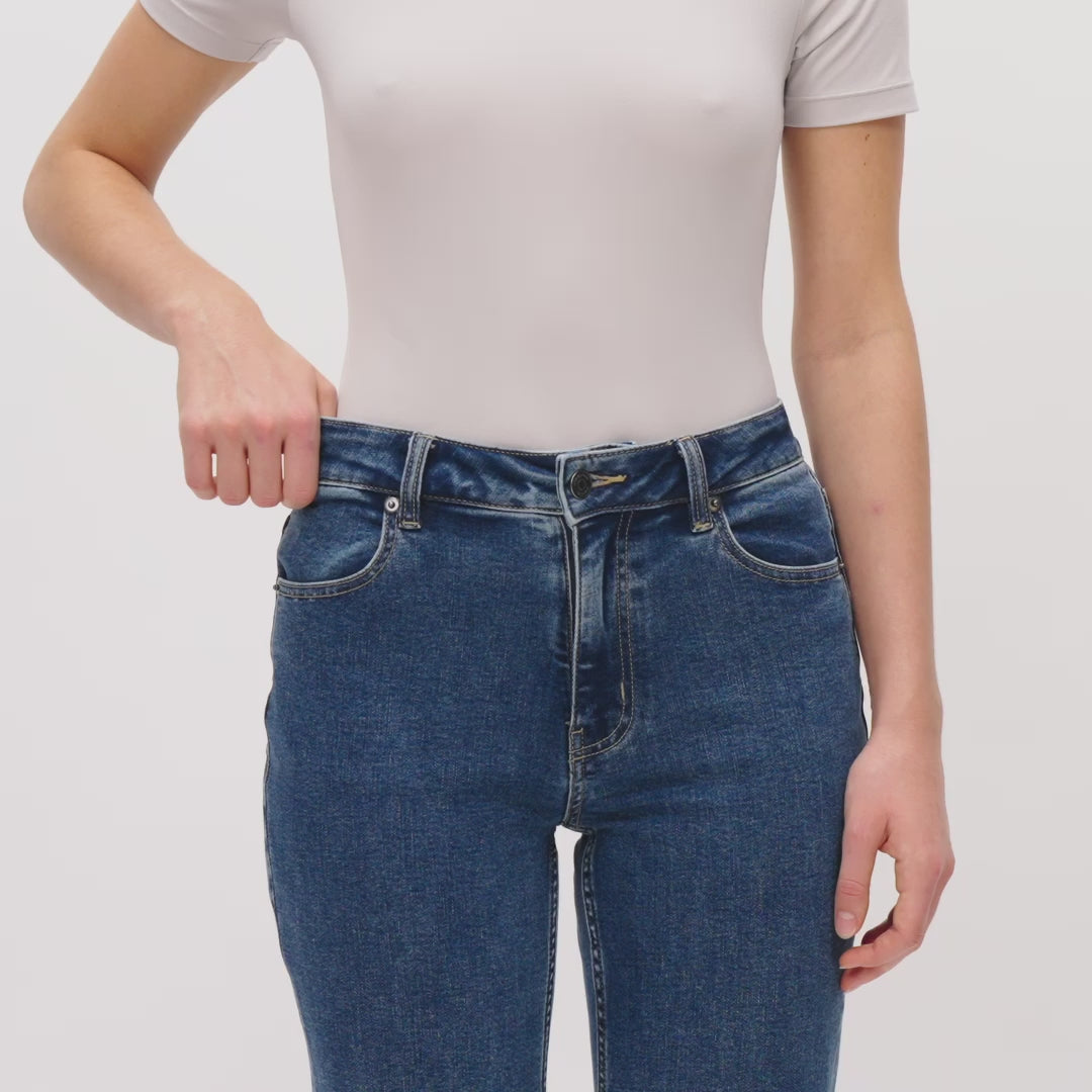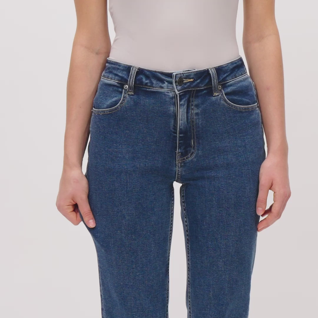 Experience the classic look of denim with the comfort of incredible stretch. Our high-waisted, straight-leg jeans are crafted from a proprietary denim blend that’s both very stretchy and thick, providing the feel of traditional denim with added flexibility. Versatile and perfect for everyday wear, these jeans are a must-have in your wardrobe.