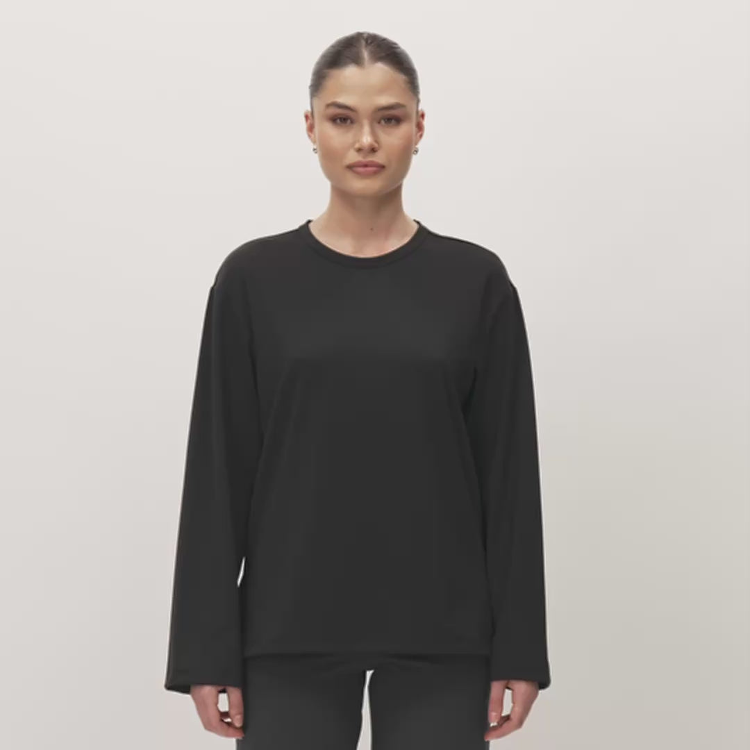 A versatile, relaxed-fit long-sleeve top designed for effortless comfort at home or on the go. Made with dropped shoulders, side slits, and a slightly longer back hem, it drapes softly with a flattering shape. The clean, bound crew neck adds a refined finish that makes it easy to dress up or down.